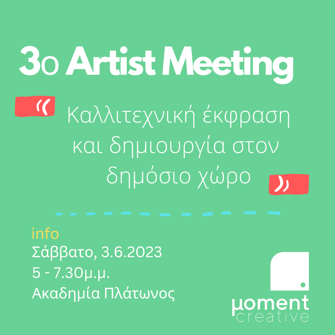 Όπως αναφέρεται, «μετά από 2 επιτυχημένα artist meetings που φιλοξενήθηκαν στην Άτρακτο τον περασμένο χειμώνα (Δεκέμβριος ‘22, Φεβρουάριος ‘23), το μοment Creative παρουσιάζει τo 3ο artist meeting με θέμα την καλλιτεχνική έκφραση και δημιουργία στον δημόσιο χώρο. Πρόκειται για μια θεματική που θα χωριστεί χρονικά σε δύο μέρη.