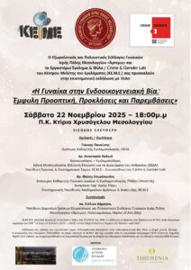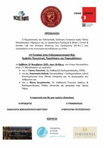 Εκδήλωση του Crime & Gender Lab του ΚΕ.Μ.Ε.: «Η Γυναίκα στην Ενδοοικογενειακή Βία – Έμφυλη Προοπτική, Προκλήσεις και Παρεμβάσεις»